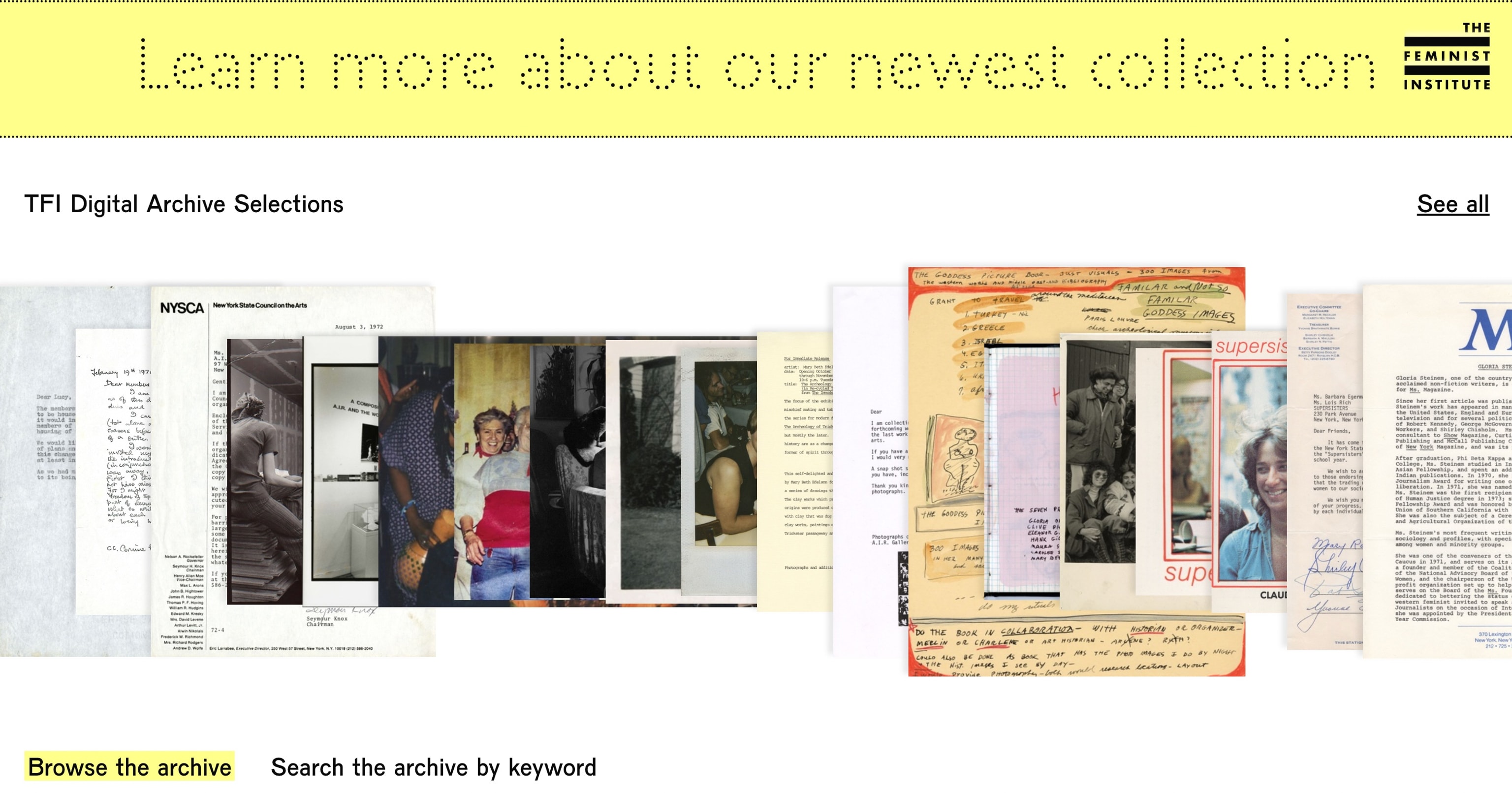 The Feminist Institute (TFI) documents and celebrates feminist contributions to culture by preserving and digitizing archival materials for public access. TFI promotes information activism and gender equity by infilling the cultural record to reflect fuller truths.
