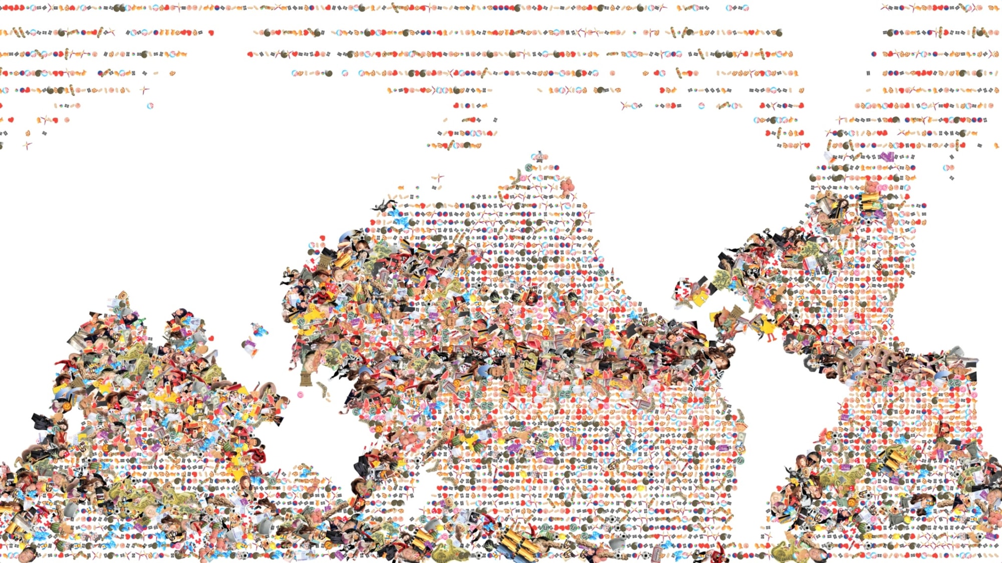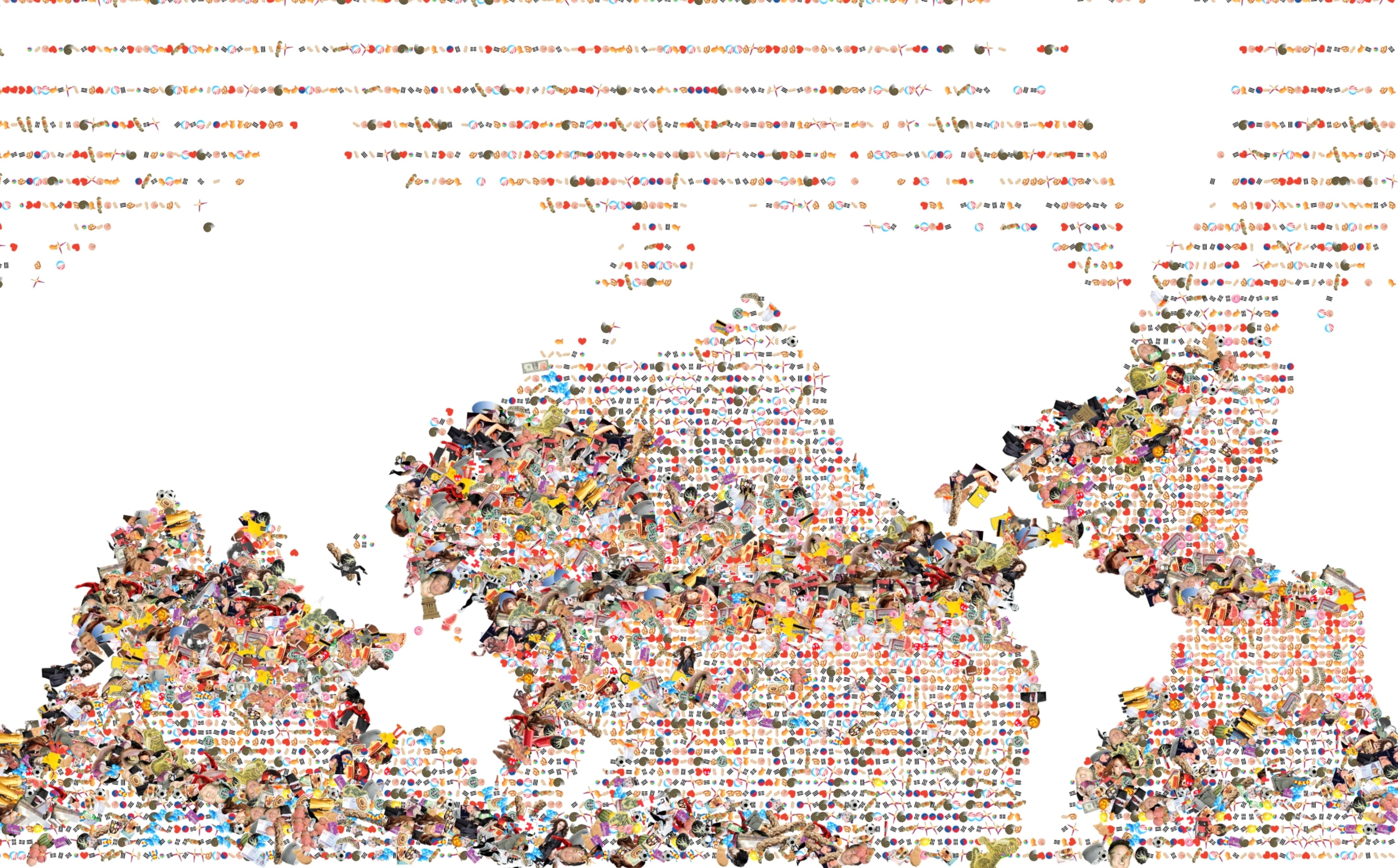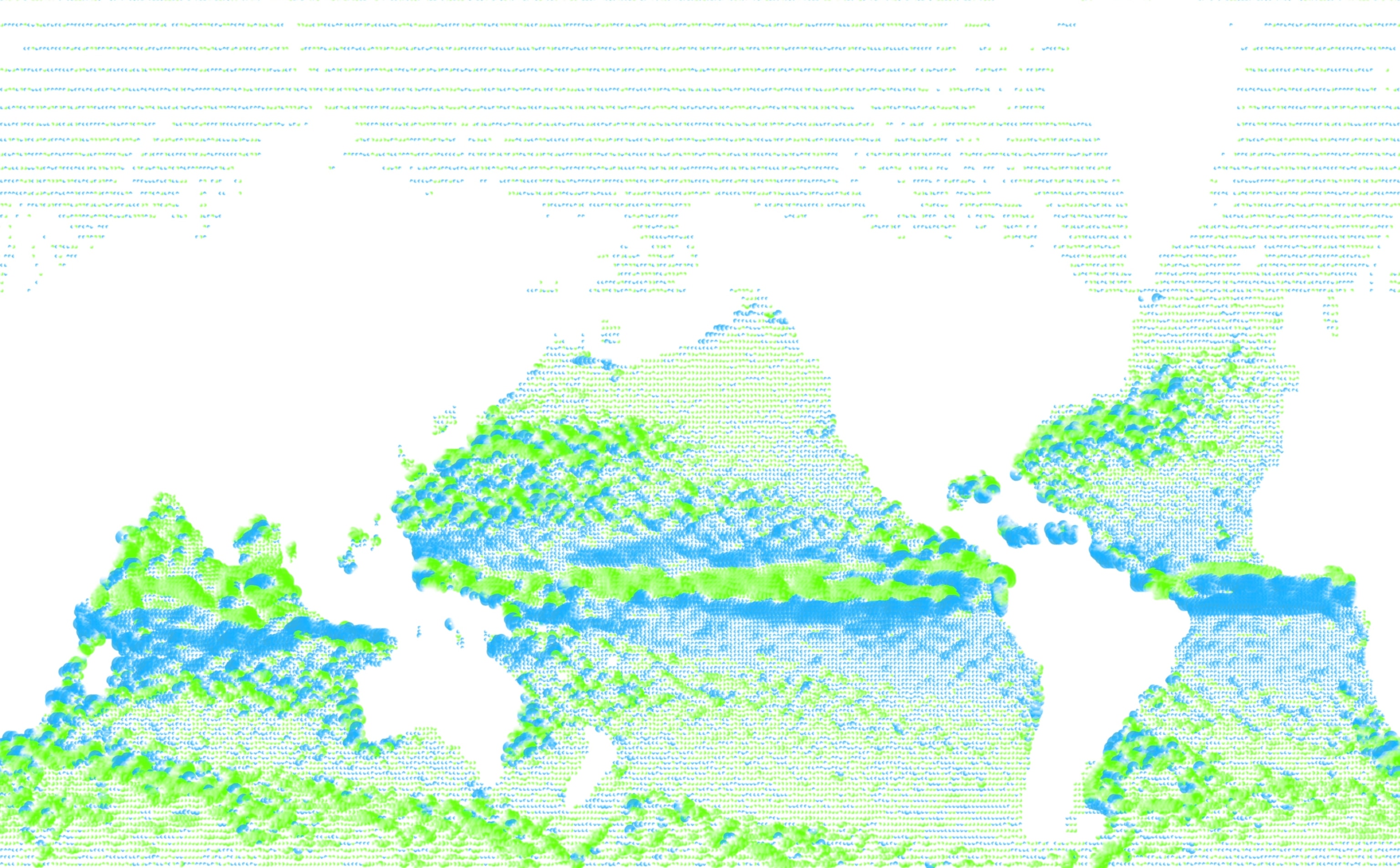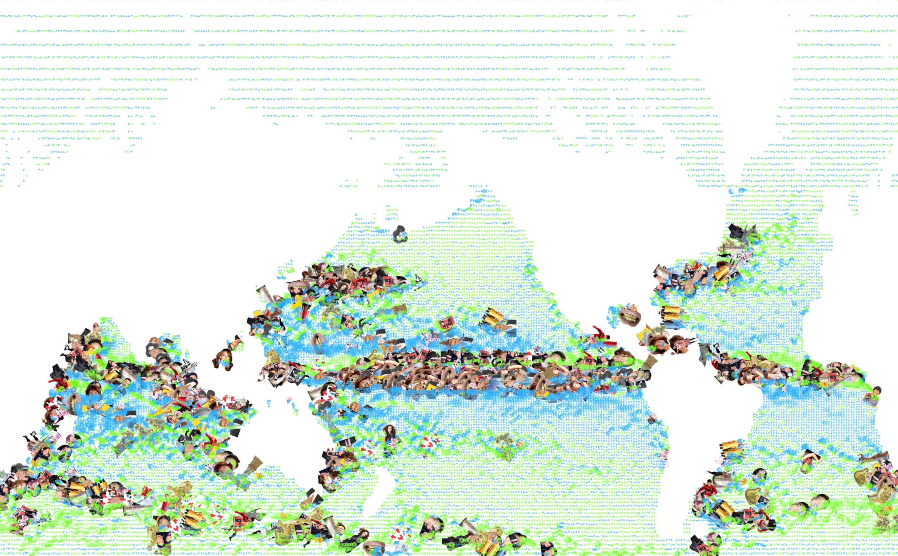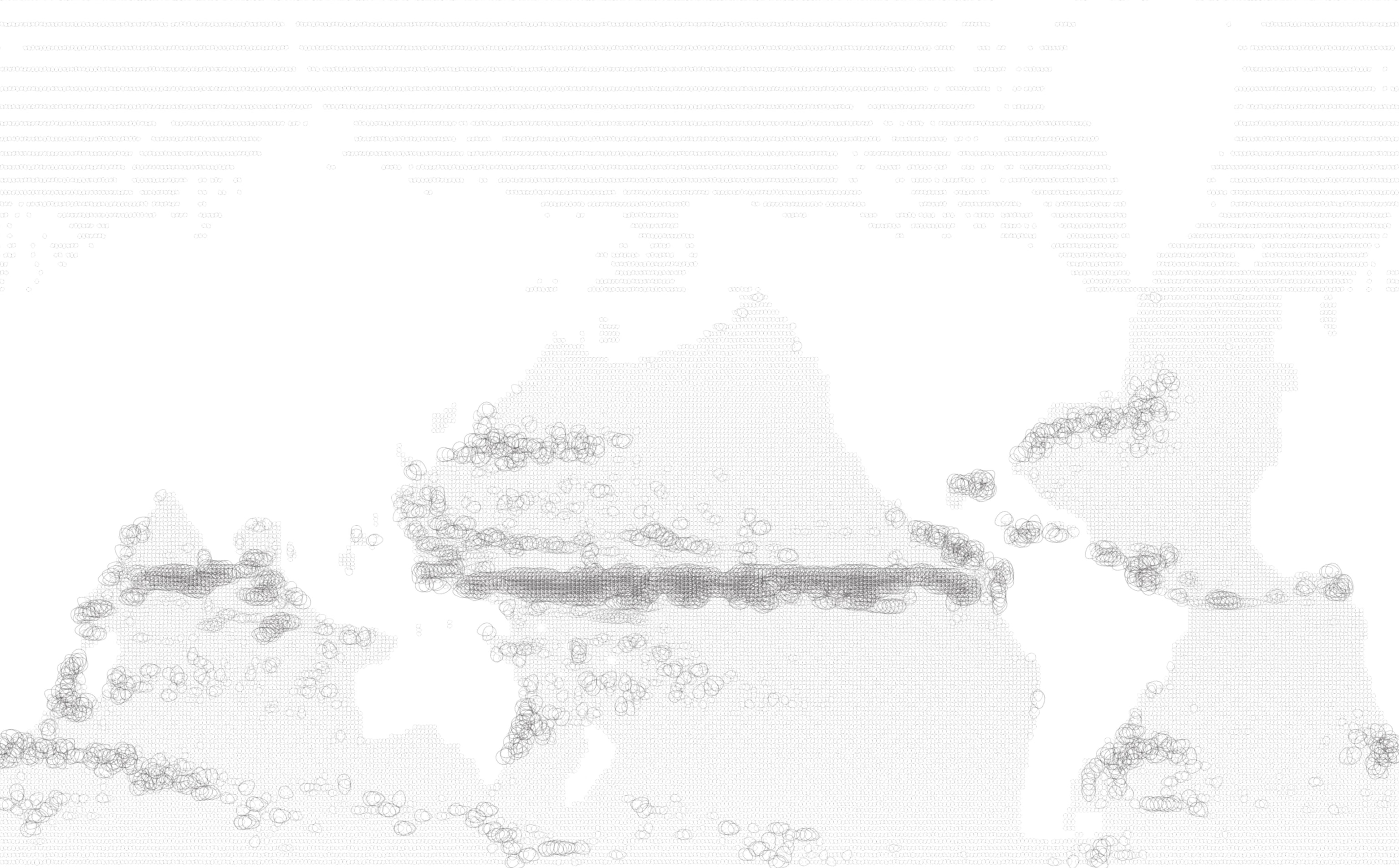 Korean artist Do Ho Suh’s science fiction project, A Perfect Home, proposes a home situated on a floating trans-Pacific bridge, halfway between New York and Seoul. We designed a 12-minute video loop that shows 16 years of global ocean current movement, drawn from NOAA’s OSCAR satellite remote sensing project; as well as Do Ho’s own flight patterns over the years. About 64 million data points are represented. The screen alternates among four different ways of displaying the data, including waving lines, breathing eggs, spinning discs, and 95 kinds of pop currency.